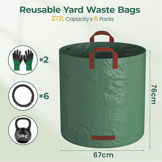 EsLuker.ly 6 Pack Garden Lawn Leaf Waste Bags, 71 Gallons Reusable Yard Litter Bag with 2 Pairs Gardening Gloves, Heavy Duty Trash Containers with Handles for Outdoor Cleanup, Ideal for Homeowners