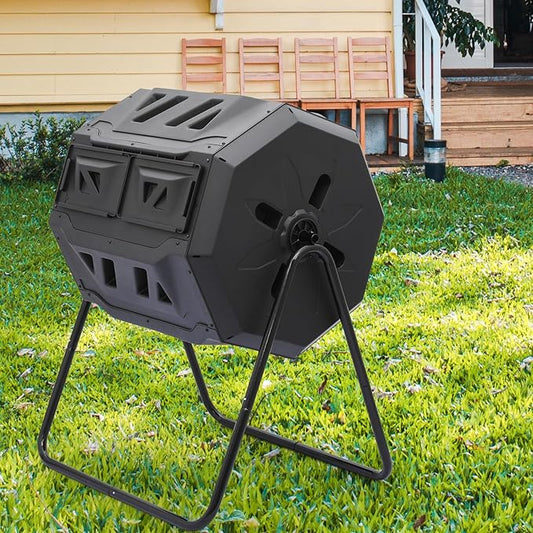 Yesker Dual Chamber Compost Bin Outdoor, 43 Gallon Rotating Tumbling Composter with Sliding Doors, Fast Assembly for Garden, Backyard & Kitchen Waste