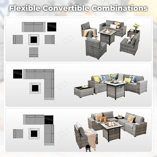 ovios 7 Pieces Patio Furniture Set, Outdoor Wicker Sectional Sofa with 30 Inch Fire Pit Table Comfy Cushions, Modern Modular Deep Seat Rattan Couch Conversation Set, Dark Grey