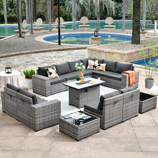 HOOOWOOO 13 Piece Modular Patio Outdoor Sectional Furniture Set with Gas Propane Fire Pit Table,Wicker Conversation Sofa Set,Out Door Couch Set with Wide Arm Outside(Black)