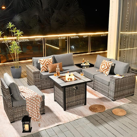 HOOOWOOO Modular Patio Outdoor Sectional Furniture Set with Gas Propane Fire Pit Table,7 Piece Wicker Conversation Sofa Set,Out Door Couch Set with Wide Arm Outside(Dark Grey)