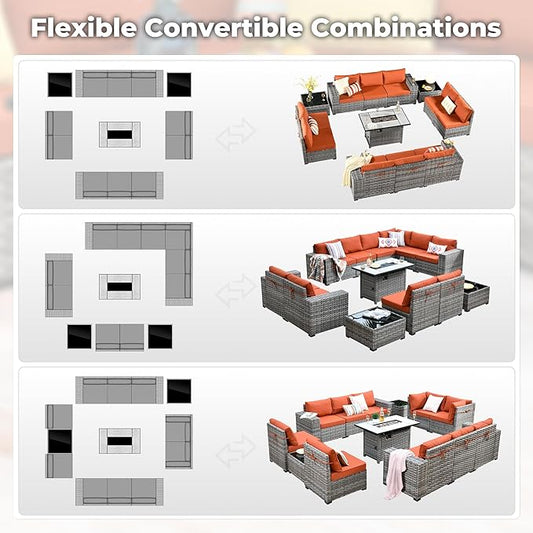 ovios 13 Pieces Patio Furniture Set, Outdoor Wicker Sectional Sofa with 42 Inch Fire Pit Table Comfy Cushions, Modern Modular Deep Seat Rattan Couch Conversation Set, Orange Red