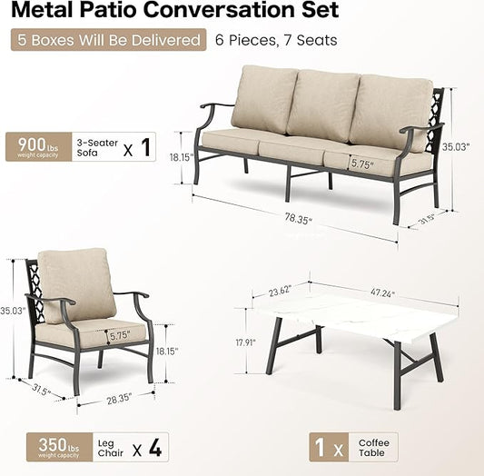 6 Piece Metal Outdoor Patio Furniture Set, Patio Conversation Sets 1 3-Seater Sofa, 4 Fixed Chairs with 5.75" Thick Cushion and Coffee Table, Backyard Furniture Set for Deck, Beige