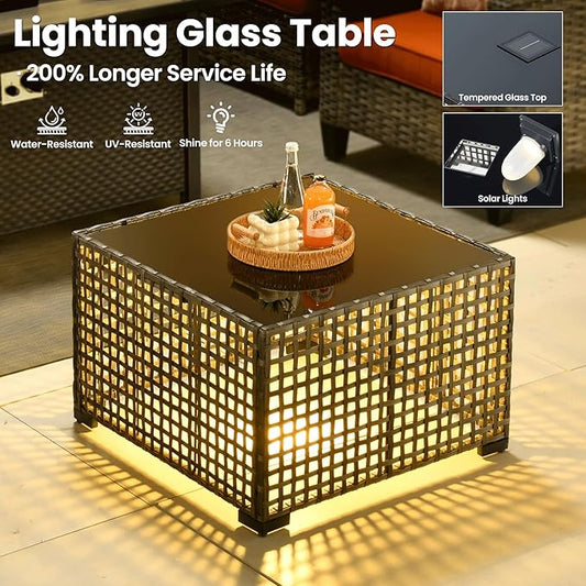 ovios 4 Pieces Patio Furniture Set Outdoor Sofa Couch with Solar Lights Table Comfy Cushions, Modern Deep Seat Wicker Rattan Conversation Set for Porch Deck, Orange Red