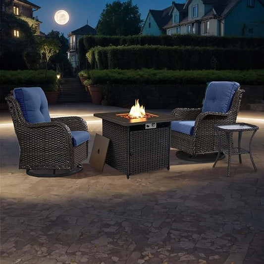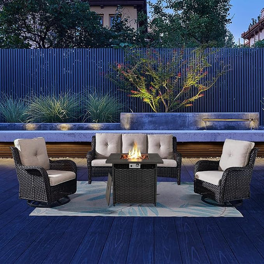 Patio Furniture 4 Piece, All-Weather PE Wicker Outdoor Furniture Set with CSA Certified 30in Propane Fire Pit Table,Outdoor Patio Furniture with Swivel Rocking Chairs