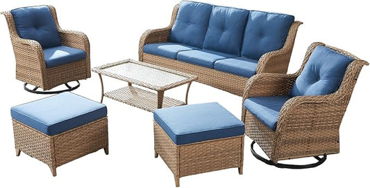 Luxury High Back Outdoor Furniture with 6-Inch Thick Cushions, Patio Furniture Set with Swivel Chairs, 6 PCS Wicker Conversation Set for Porch, Balcony, Deck and Yard
