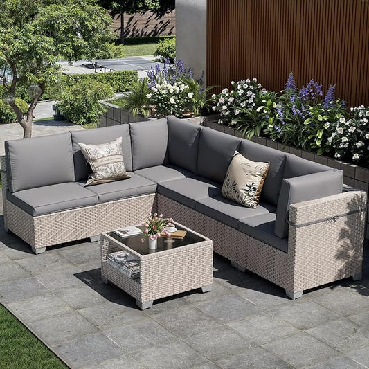 7 Pieces Patio Furniture Set, Outdoor Sectional Wicker Sofa with Thick Cushions and Storage Coffee Table, Rattan Patio Conversation Sets for Deck Yard Poolside, Grey