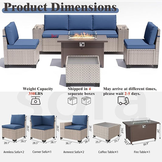 ovios 7 Pieces Patio Furniture Set, Outdoor Wicker Sofa Couch with Swivel Chairs 42" Fire Pit Table, All Weather High Back Modern Conversation Sets, Brown Rattan, Navy Blue