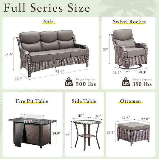 ovios 7 Pieces Patio Furniture Set, Outdoor Wicker Sofa Couch with Swivel Chairs 54" Fire Pit Table, All Weather High Back Modern Conversation Sets, Grey Rattan, Grey