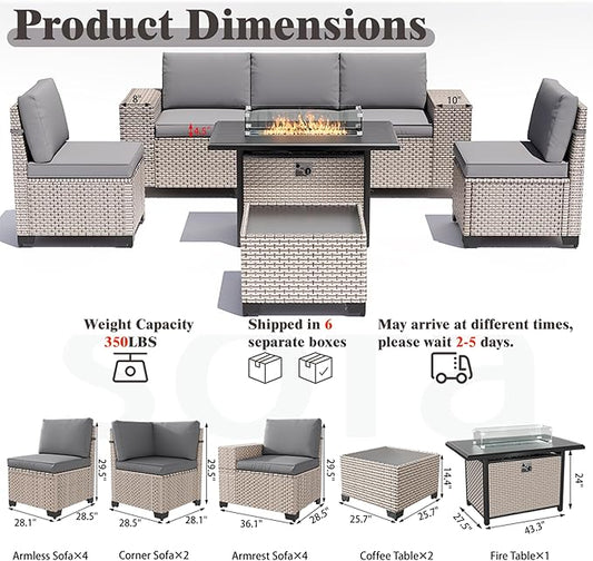 ovios 10 Pieces Patio Furniture Set, Outdoor Wicker Sofa Couch with Swivel Chairs 54" Fire Pit Table, All Weather High Back Modern Conversation Sets, Grey Rattan, Grey