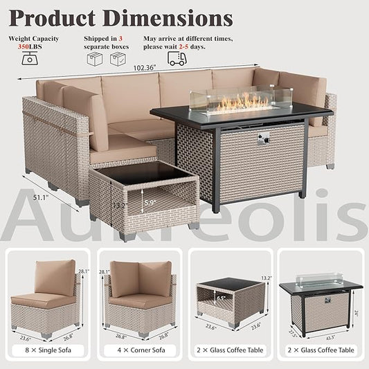 8 Pieces Patio Furniture Set with Fire Pit Table, Outdoor Sectional Wicker Sofa with Thick Cushions and Storage Coffee Table, Rattan Patio Conversation Sets, Khaki