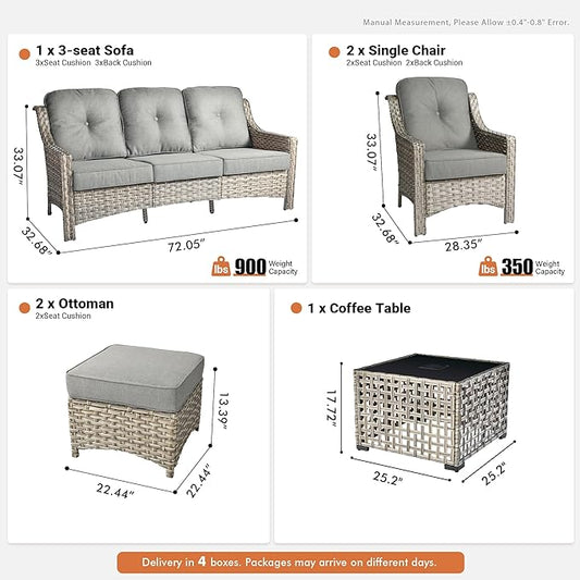 6 Pieces Patio Outdoor Furniture Set,All Weather Wicker Rattan Patio Seating Sofa and Chair Set w/Ottoman and Glowing Coffee Table,Outdoor Conversation Sets for Deck Yard Garden,Dark Grey