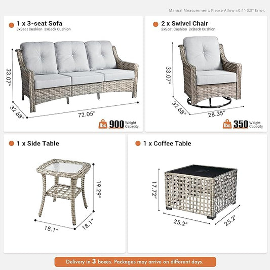 5 Pieces Patio Outdoor Furniture Set with Swivel Rocking Chairs,All Weather Wicker Rattan Patio Seating Sofa and Chair Set w/Glowing Table,Outdoor Conversation Sets for Deck Yard Garden,Grey