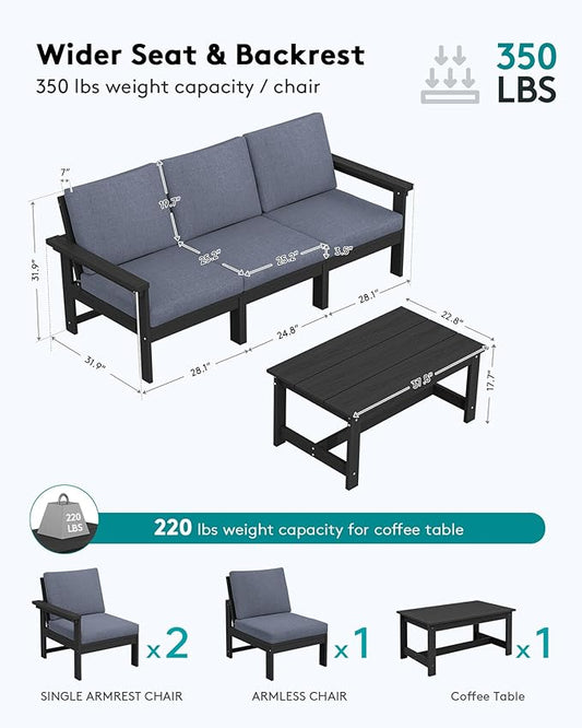 SERWALL HDPE Patio Sofa Set, 4-Piece Sectional Outdoor Furniture Set, All Weather Outdoor Couch Set Patio Furniture Set for Deck, Lawn, Black Frame with Grey Cushion