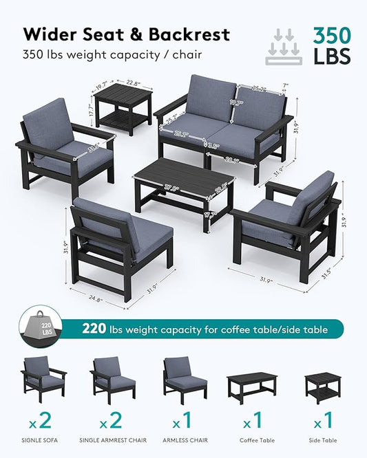 SERWALL HDPE Patio Conversation Set, 6-Piece Sectional Outdoor Furniture Set, All Weather Outdoor Couch Set Patio Furniture Set for Deck, Lawn, Black Frame with Grey Cushion