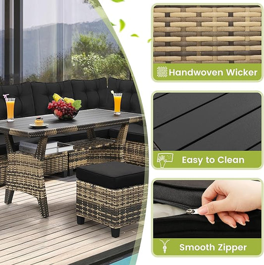 6-Piece Outdoor Patio Furniture Set - Sectional Sofa, Dining Table & Chairs Included, All-Weather Dining Set with Ottoman, Natural Wicker and Black Cushions