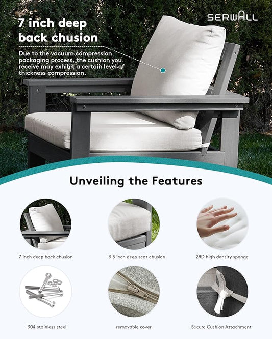 SERWALL Outdoor Patio Sofa Set, 2-Piece HDPE Single Seat Outdoor Sofa Chair with Padded Cushions, Black Frame with Grey Cushion