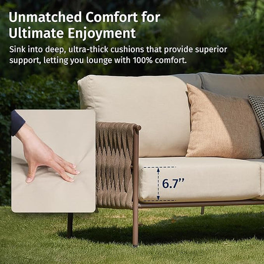 EAST OAK Life Chatter Patio Furniture Set, Outdoor Furniture Sectional Sofa Set with Round Coffee Table, 4 Seats Sofa Deep Seating with Thick & Washable Cushions, Chestnut Brown & Creamy Apricot