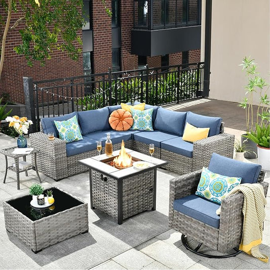 HOOOWOOO 9 Piece Modular Patio Outdoor Sectional Furniture Set with Gas Propane Fire Pit Table,Wicker Conversation Sofa Set with Swivel Chairs,Outside Couch Set(Denim Blue)