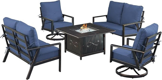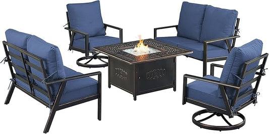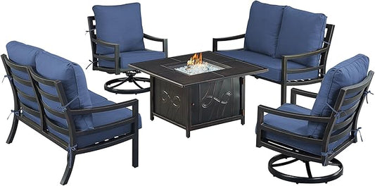 Oakland Living Black Aluminum Patio Fire Table Set with Two Deep Seating Loveseat with Cushions and Two Club Chairs with Blue Cushions