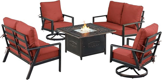 Oakland Living Black Aluminum Patio Fire Table Set with Two Deep Seating Loveseat with Cushions and Two Club Chairs with Red Cushions