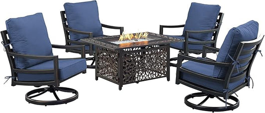 Oakland Living Black Aluminum Patio Fire Table Set with Four Club Chairs with Blue Cushions