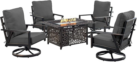 Oakland Living Black Aluminum Patio Fire Table Set with Four Club Chairs with Black Cushions
