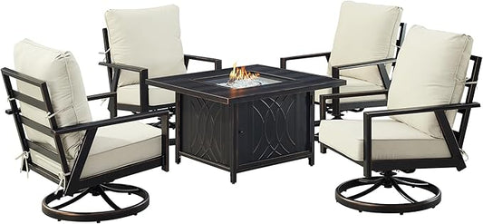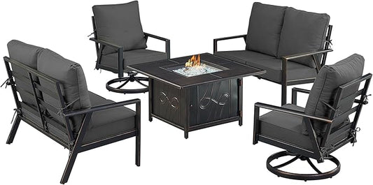 Oakland Living Black Aluminum Patio Fire Table Set with Two Deep Seating Loveseat with Cushions and Two Club Chairs with Black Cushions