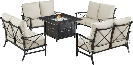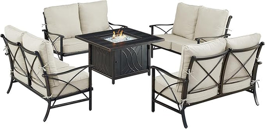 Oakland Living AHRI-4LS-CAVE-LGCU-AC Black Aluminum Patio Fire Table Set with Four Deep Seating Loveseat with Cushions, Antique Copper