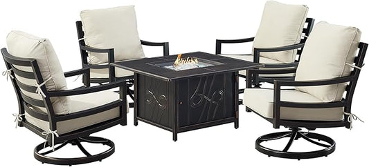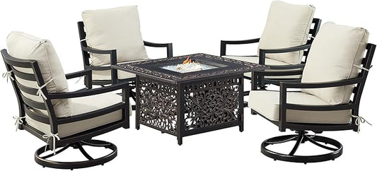 Oakland Living Black Aluminum Patio Fire Table Set with Four Club Chairs with Light Grey Cushions