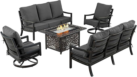 Oakland Living Black Aluminum Patio Fire Table Set with Two Deep Seating Sofa with Cushions and Two Club Chairs with Black Cushions