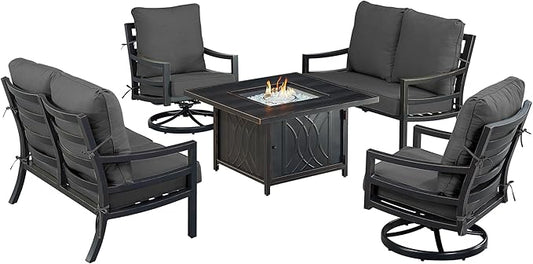 Oakland Living Black Aluminum Patio Fire Table Set with Four Deep Seating Loveseat with Cushions with Black Cushions