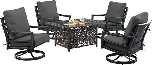 Oakland Living Black Aluminum Patio Fire Table Set with Four Club Chairs with Black Cushions
