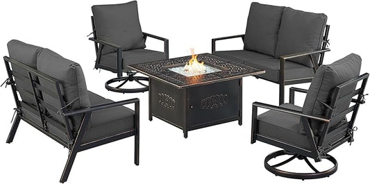 Oakland Living Black Aluminum Patio Fire Table Set with Two Deep Seating Loveseat with Cushions and Two Club Chairs with Light Grey Cushions