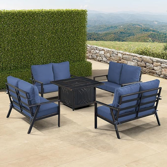 Oakland Living Black Aluminum Patio Fire Table Set with Four Deep Seating Loveseats with Cushions with Blue Cushions