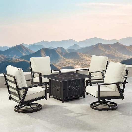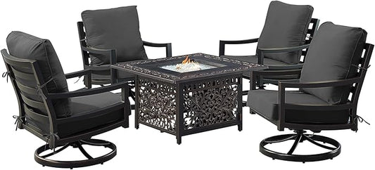 Oakland Living Black Aluminum Patio Fire Table Set with Four Club Chairs with Black Cushions