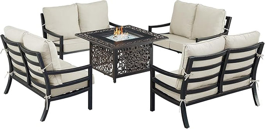 Oakland Living Black Aluminum Patio Fire Table Set with Four Deep Seating Loveseat with Cushions with Light Grey Cushions