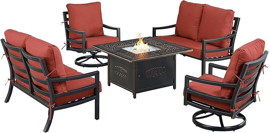Oakland Living Black Aluminum Patio Fire Table Set with Two Deep Seating Loveseat with Cushions and Two Club Chairs with Red Cushions