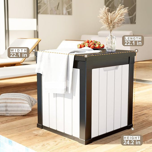 ROJIK Outdoor Storage Housing Deck Box - Waterproof Patio Furniture, Garden Tools, Cushions, Pool Accessories Storage Bench with Lockable Lid and Side Handles (Black & Whiter, 50 Gal)
