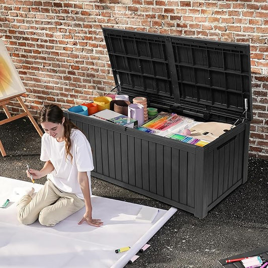 151 Gallon Outdoor Storage Box,Resin Large Sturdy Deck Box, Backyard Outside Storage Box Waterproof with Double Wall Panels,Package Delivery Garden Outdoor Hose Storage Bin,Black