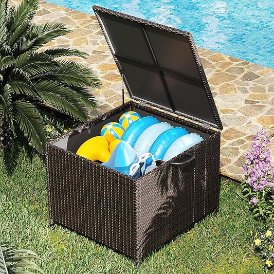 NUNU LAB 150 Gallon Outdoor Storage Box,Resin Large Sturdy Deck Box, Backyard Outside Storage Box Waterproof with Double Wall Panels,Package Delivery Garden Outdoor Hose