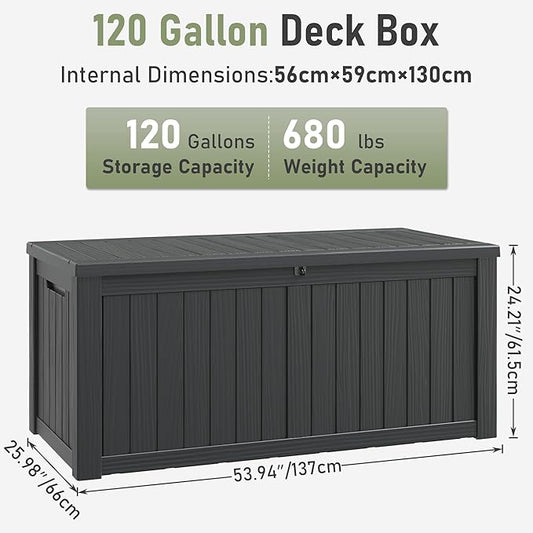 120 Gallon Deck Box,Waterproof Resin Outdoor Storage Box Lockable for Patio Furniture Cushions, Garden Tools, Heavy-Duty Double-Wall Structure with Gas Lift and Reinforced Seat Lid, Black