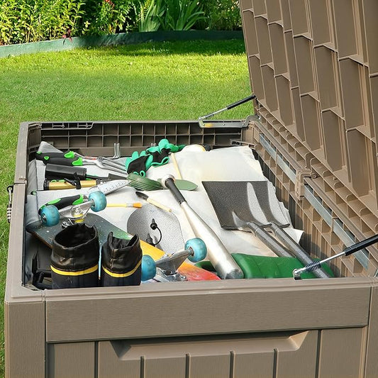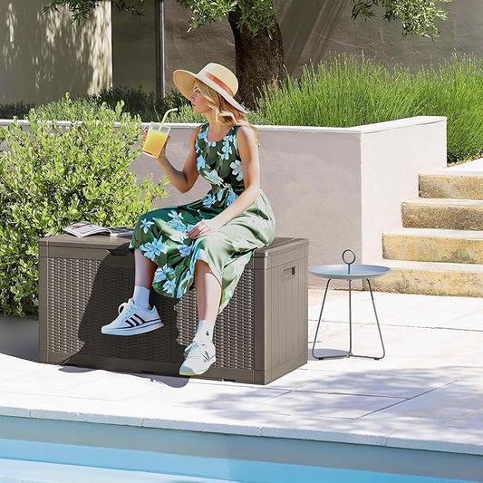 Devoko 97 Gallon Deck Box, Waterproof Resin Outdoor Storage Box for Outside and Patio, Large Outdoor Storage Bench Cabinet Lockable for Patio Furniture, Garden Tools and Pool Supplies (Brown)