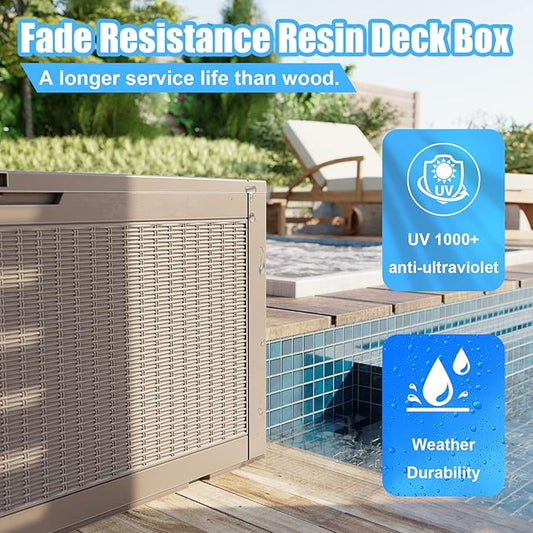 DRATO 260 Gallon Deck Box, Outdoor Large Waterproof Resin Storage Box with Lockable Lid for Patio Cushions, Gardening Tools, Sports Equipment, Light Brown