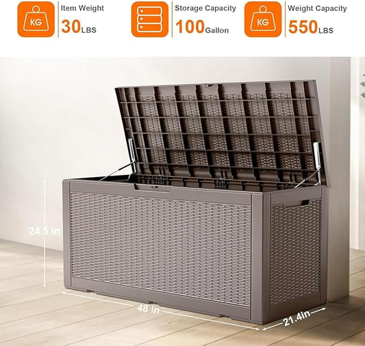 DRATO 100 Gallon Large Deck Box, Outdoor Storage Box for Patio Furniture, Patio Cushions, Gardening Tools, Pool Supplies,660lbs Weight Capacity,Waterproof Resin Storage Boxes