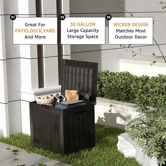 31 Gallon Waterproof Outdoor Resin Deck Box with Lockable Lid, Stylish Wicker Pattern, Easy Assembly Features and Convenient Handles For Patio Cushion, and other Patio Furniture (Black)