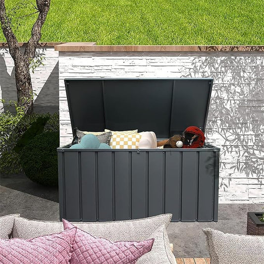 CHUNLY 100 Gallon Metal Waterproof Storage Deck Box with Lockable Lids Indoor Outdoor Storage Bench Patio Storage Bin for Outside Cushions, Throw Pillows, Garden Tools (Dark Gray)