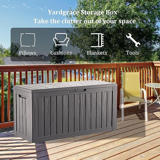 100 Gallon Large Resin Deck Box - Lockable Waterproof Outdoor Storage Bench for Patio Cushions, Garden Tools & Pool Accessories - Wood-Look Texture, Weather-Resistant for Backyard & Porch