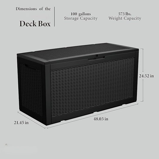 100 Gallon Deck Box,Resin Outdoor Storage Box with Lockable for Patio Furniture, Pool Accessories, Garden Tools Waterproof Outside Storage Box, Black