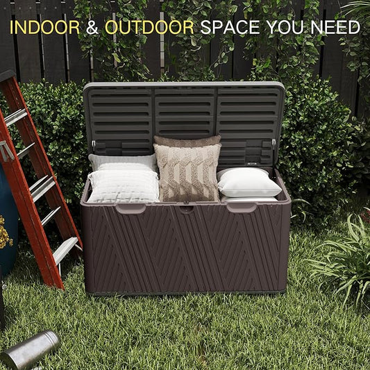 Kingdura 110 Gallon Outdoor Storage Box, Waterproof Resin Deck Box for Indoor and Outdoor Use, Lockable Storage Container for Patio Furniture Cushions Garden Tools (Coffee, 110 Gallon)